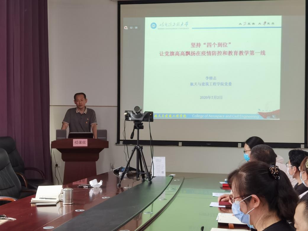 为深入学习贯彻习近平总书记关于疫情防控重要讲话和指示批示精神,进一步强化“四个意识”、坚定“四个自信”,提高党员“一盘棋”理念,提升党支部书记讲党课能力水平,按照学校党委“七个一”通知要求,航天与建筑工程学院于7月2日下午15时,在11号楼3067会议室设主会场,各党支部书记、基层学术组织负责人网上参加的形式,由党委书记李修志同志进行题目为《坚持“四个到位”让党旗高高飘扬在疫情防控和教育教学第一线》的微党课授课。